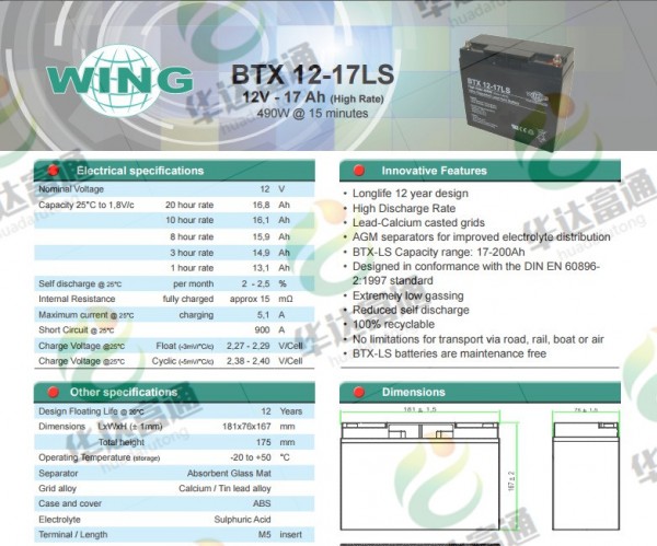 ?德国WING蓄电池--原装进口 ◆ 电池使用温度范围广(-30℃~50℃),自放电低。