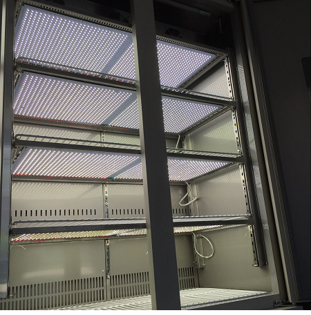 17.光源数量:LED光源板防水防腐蚀,材质为铝基板,散热效果好,光源板设计成可以拆卸结构,安装操作方便,光源板尺寸460*420mm,每一块有675颗灯珠,每层2块,共计6块,合计4050颗灯珠,分布均匀,叠加重叠,箱体内部所有灯板和搁架可以任意拆卸,不需要光照的时候可以做低温储藏,做到了一箱多用的功能。