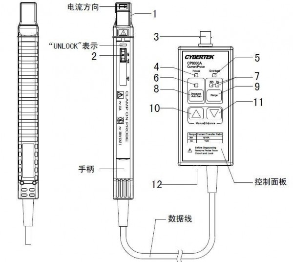 CP8030B/H 分为 30A 和 两个量程:30A 量程,探头电流传输比 0.1V/A; 量程,探头电流传输比 1V/A。
