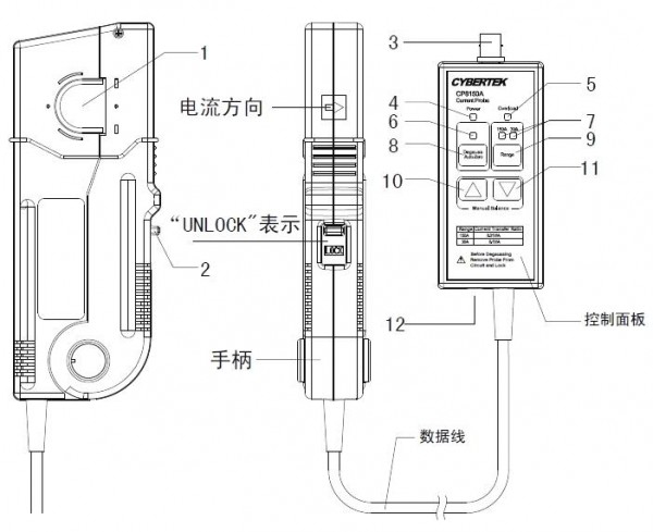 控制传感器头开合的操纵杆。测量电流时应先拉操纵杆打开传感器,放入被测导线。然后再推操纵杆使探头处于 LOCK 状态。