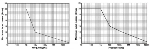 图 2.a CP8030B zui大测量电流 VS 频率曲线 图 2.b CP8030H zui大测量电流 VS 频率曲线