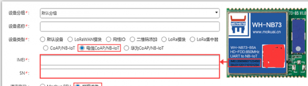 选择“电信CoAP/NB-IoT”,填写IEMI和SN,选择数据透传。
