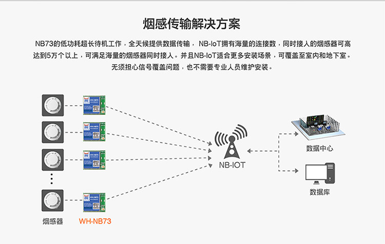 NB73的低功耗超长待机工作,全天候提供数据传输,NB-IoT拥有海量的连接数,同时接入的烟感器可高达到5万个以上,可满足海量的烟感器同时接入。并且NB-IoT适合更多安装场景,可覆盖至室内和地下室。无须担心信号覆盖问题,也不需要专业人员维护安装。