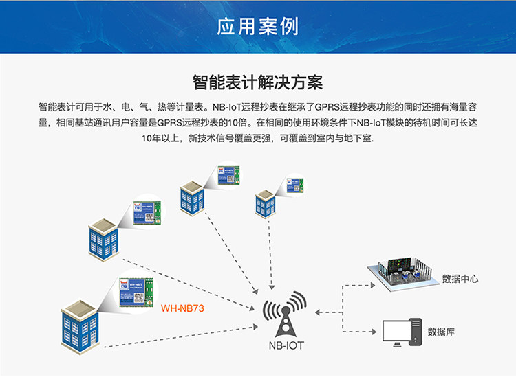 智能表计可用于水、电、气、热等计量表。NB-IoT远程抄表在继承了GPRS远程抄表功能的同时还拥有海量容量,相同基站通讯用户容量是GPRS远程抄表的10倍。在相同的使用环境条件下NB-IoT模块的待机时间可长达10年以上,新技术信号覆盖更强,可覆盖到室内与地下室。
