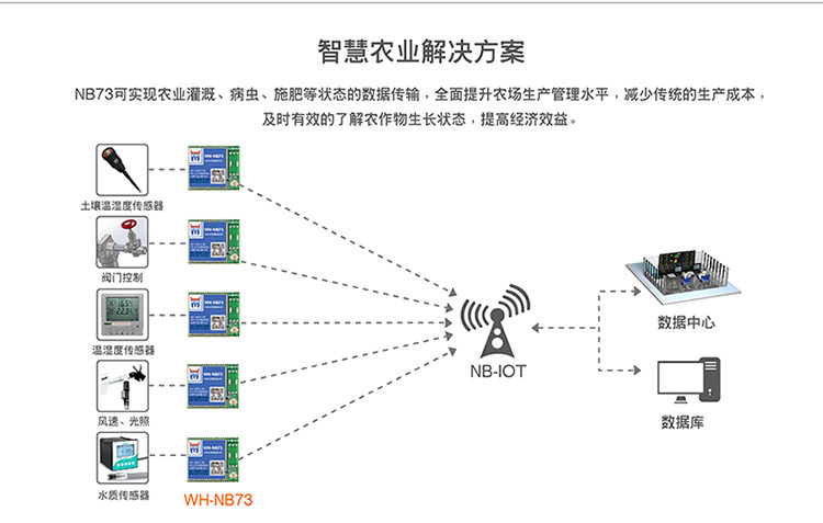 NB73可实现农业灌溉、病虫、施肥等状态的数据传输,提升农场生产管理水平,减少传统的生产成本,及时有效的了解农作物生长状态,提高经济效益。