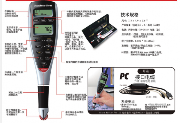 地图笔版拥有的数字规划测量来测量项目,让估算、投标或规划更快速、准确、有保障。你还可以用可选的接口电缆将它连接到你的电脑上,并将滚动值直接转换成常用的电子表格或估算程序,节省时间并减少抄写错误的可能性。