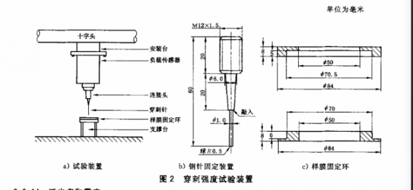 将直径为100mm的试片安装在样膜固定夹环上,然后用直径1.0mm,直径顶端半径为0.5mm的钢针,以(50±5)mm/min的速度去顶刺,读取钢针穿透试片的zui大负荷。测试片数5个以上,取其算术平均值。穿刺强度试验装置如图所示: