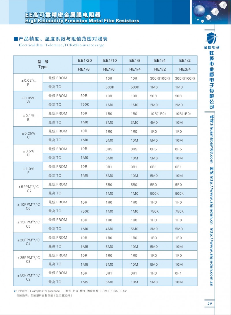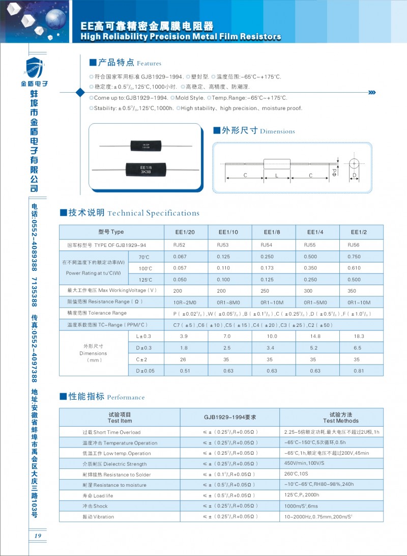 精密金属膜电阻器制造工艺,是基于对元件失效的基础理论研究并采用了类似半导体器件制造的各种先进手段,生产全过程、每只电阻均受到严格电气、机械及外观方面的检验(工序AOL值为0.25,成品AOL值为0.65),电阻器的温度系数和阻值精密,可由电子计算机自由选配,以满足用户需要,产品具有高可靠性技术指标可供国防军工、仪器仪表以及其它电子设备的使用。高可靠、高稳定、高精度、模压、绝缘、防潮湿、耐侵蚀。