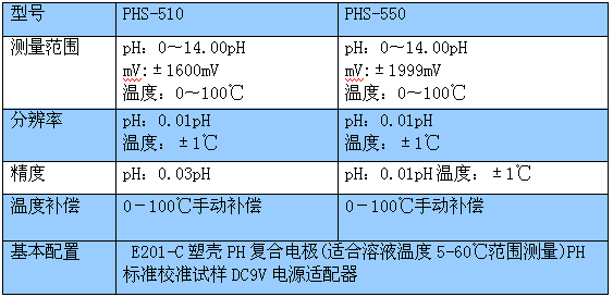 基本配置 E201-C塑壳PH复合电(适合溶液温度5-60℃范围测量)PH标准校准试样DC9V电源适配器。