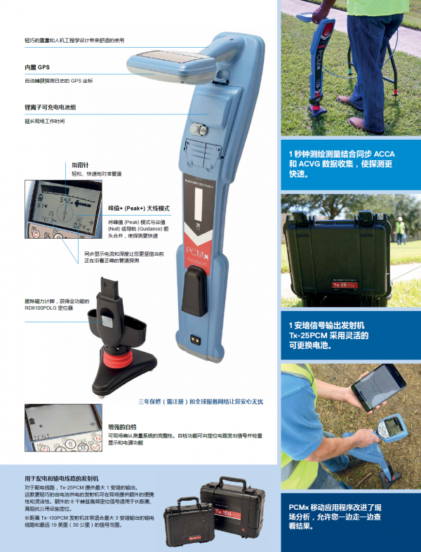 管道外防腐层评估系统PCMx 继承了这一血统,利用雷迪的定位技术的力量,带来更快的结果、同步探测测量以及集成 GPS 定位。