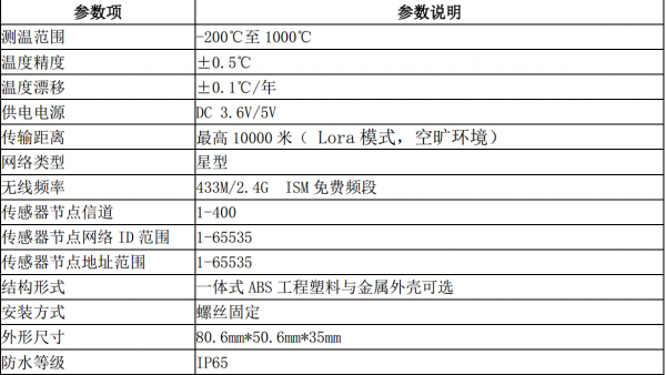 集温度采集与传输于一体的智能无线温度传感器, 能够精致测量温度。温度测量部分采用 BLY 特殊定制专业的电阻式传感器,外加传感器专用金属防护罩,保证了测量数据的可靠性与稳定性。 信号传输方式可选择,支持 433M/2.4G 多种频段,传输协议可选择,支持 Lora,Zigbee,6LowPan 协议;可覆盖 90%的各种应用场景。 多套温度传感器与无线路由器可组成完整的温度监测系统。 此款产品zui大的特点在于:采用 BLY 定制专用传感器,温度范围(-200 度--1000 度); 无线距离长短可调, 无线覆盖监测范围 0-10km; 设计传感器寿命长达 10 年无需换电池(电池容量 1500mAH,距离 200 米以内, 10 秒更新一次数据),是真正意义上的“双十”产品,即十公里无线传输距离, 十年不换电池。