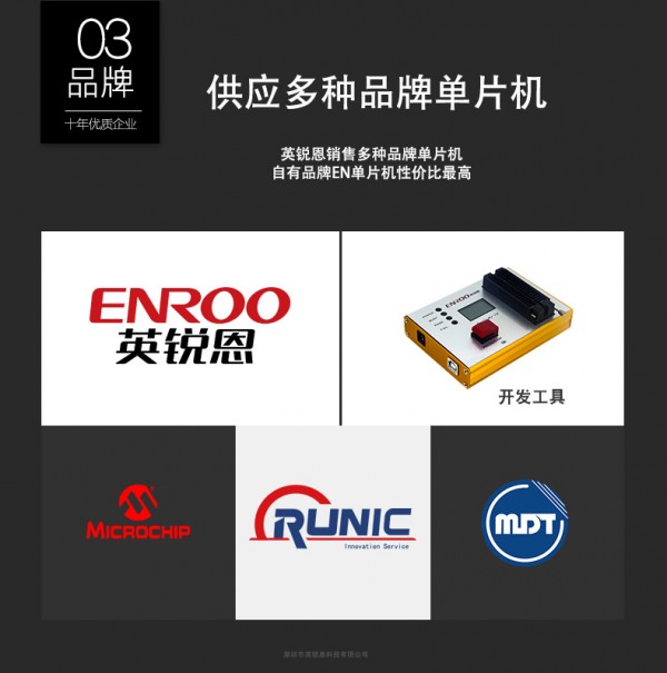 英锐恩在2008 年取得Microchip 授权的Design Partner(Microchip Authorized DesignPanter)。现代理销售的品牌有美国微芯(Microchip),思瑞浦微(3PEAK)及MDT 等,产品涉及8/16/32-Bit 单片机、通信接口、运算放大器、比较器、电源管理、存储器、MOSFET 等。公司根据多年行业技术研发经验,合作研发了自有品牌EN 系列产品线,包括EN 8-bit MCU(单片机)、EN 专用智能方案芯片及EN 模拟器件与接口电路等,致力于汽车电子、通信产品、电动车、家电产品、智能安防产品、蓝牙系列产品、便携式数码产品、工控仪表产品、医疗保健产品等科技产品的开发设计以及相关领域的产品技术服务,所推广的方案和产品已在各领域取得可观的成绩。专业、专注、专一为客户提供产品销售、选型指导、技术咨询、工具应用支持、各类智能产品应用开发设计、售前售后服务;同时专业承接各类智能电子产品开发设计。