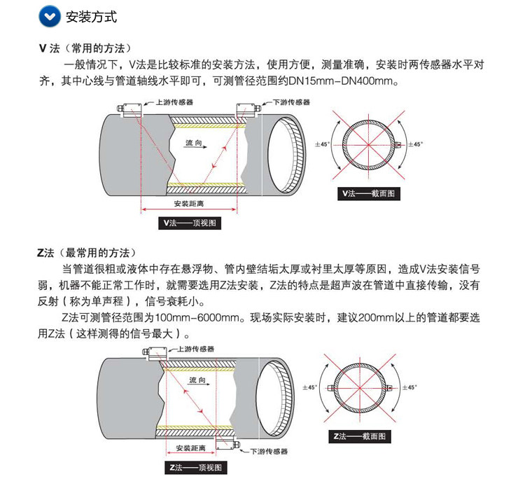 (2)由换能器和转换器两部分构成。换能器安装在被测管道的外壁上,无需将管道截断或流体停流。是一种非接触式测量,不阻挠管道内流体的流动,无压力损失、无水质泄漏,安装简单操作方便,量程范围广,适合各种口径的管道。智能度高,仪表维护量小。
