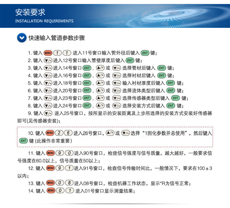 使用者在安装好小管径超声波流量计后要对下列项目进行检查:收信号强度、信号良度 Q值、时差、 估测的液体声速、信号传输时间比等。只有这样流量计才能稳定运行、测量准确。