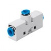 FESTO真空发生器的工作原理是:所有喷射泵都是用压缩空气驱动的,压缩气体流进喷射泵,在里面气体被分散压进一个或多个孔中,在膨胀储能时,压力和热力被转化成机械能,压缩空气的喷射速度会讯速增加,而与此同时,气体的压力与温度将下降,结果吸进更多的空气,而因此在吸入端产生一个真空。