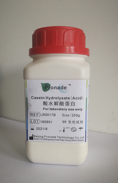 酸水解酪蛋白是以天然牛奶蛋白为原料,经盐酸水解、脱色、脱盐、喷雾干燥而成的产品,含有18种游离氨基酸,含氮和蛋白量均大于80%。氨基酸是合成蛋白质的基础,是生物生长zui基本的营养成分之一。微生物可通过蛋白质间接获取氨基酸,但需要胃酸和酶的水解,当蛋白质被盐酸水解成氨基酸时,试剂级酸水解酪蛋白可用作微生物的培养基。其性状白色或浅黄粉末、易溶于水、易潮解、具有酱香味。酪蛋白水解后(水解酪素),富含21种氨基酸,氨基酸种类齐全。因此常用于制备培养基。