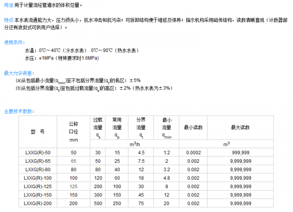特点:本水表具有流通能力大,压力损失小,重量轻,体积小,结构紧凑,使用和维修方便。计数器部分有 C型(指针指示)、E型(字轮指示)、液封式可供用户选择。产品符合标准GB/T778.1~3-1996。