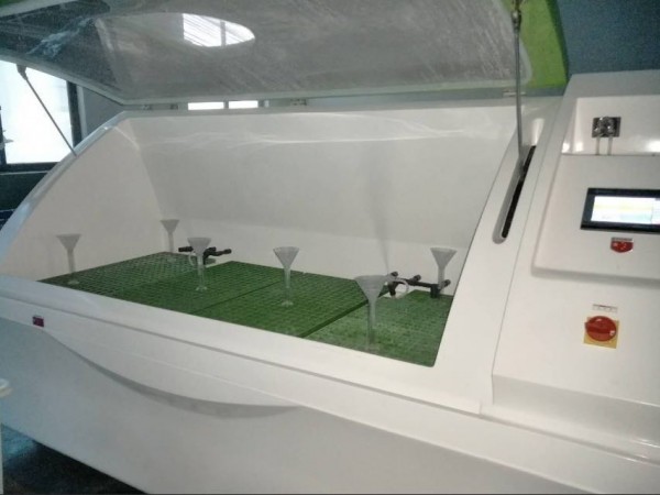1.高品质复合材料一体成型,放置设备遇高温变形; 2.控制箱盖开启和关闭,自动化方式轻松启动箱盖; 3. 前置视窗轻松观察测试样品腐蚀情况; 4.多方位调节雾化喷嘴,方便使用者找到zui佳盐雾沉降量雾化位置; 5.可调速蠕动泵,避免了传统完全通过压缩空气虹吸方式雾化盐雾,难以调节沉降量均匀性的弊端; 6.高分辨触摸屏,直观的显示各个参数的运行状况; 7.强制自动除雾系统,避免了传统随时可以开启盐雾箱盖,造成盐雾外溢,腐蚀实验室和其他设备; 8.自动干燥压缩空气盐雾和饱和压缩空气盐雾切换系统,保证不同盐雾测试标准需要; 9.干式密封完全隔箱内和实验室环境的联通渠道; 10.100L大容量盐溶液箱满足整周盐雾测试所需; 11.周到的随机管件,避免不同制式管件衔接的困难; 12.0.9米的低前沿设计,方便测试工程师取放测试样品; 13.倾斜的箱内前沿设计,增大了测试区域面积,zui有效利用箱内空间;