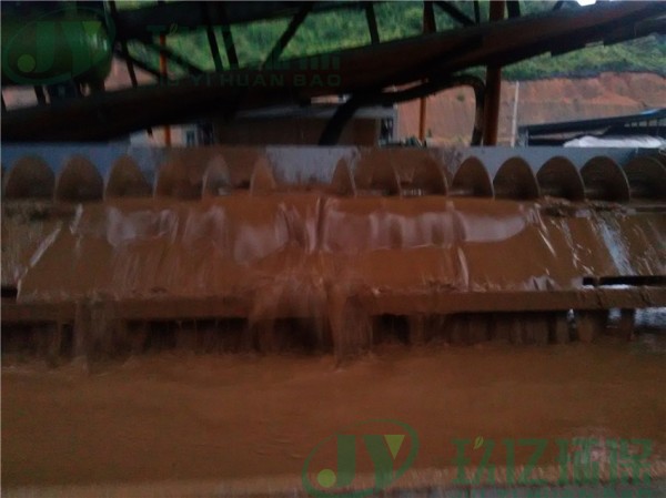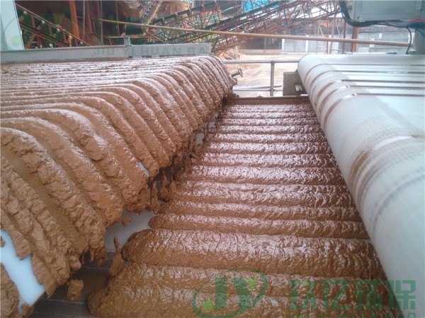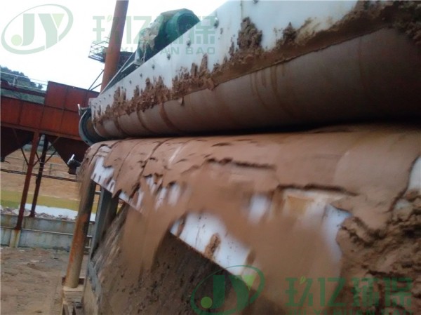 洗沙污泥过滤设备的工作原理:经过絮凝的悬浮物料在重力脱水段脱去大部分游离水,物料逐渐得到进一步浓缩,然后通过翻转机构卸料至上下滤带之间,进入楔形区内进行预压脱水,经主脱水辊脱水后,进入系列排列的压辊压榨脱水直至形成滤饼后卸料。在这过程中污泥受挤压,剪切作用力,可脱去其中大部分游离水