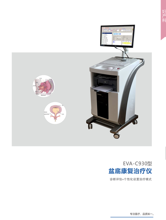 EVE-C930盆底康复治疗仪是一款带有生物(压力)反馈加电刺激,主动式训练和被动式治疗相结合的治疗仪器,仪器通过腔内探头客观地评估出患者的肌肉损伤程度,形成盆底功能检测报告,临床医生依据评估结果从医师方案中选择或自定义设置各种治疗方案,包括治疗时间,电流参数,电流波形,生物反馈模式等,按疗程对病人进行康复治疗。