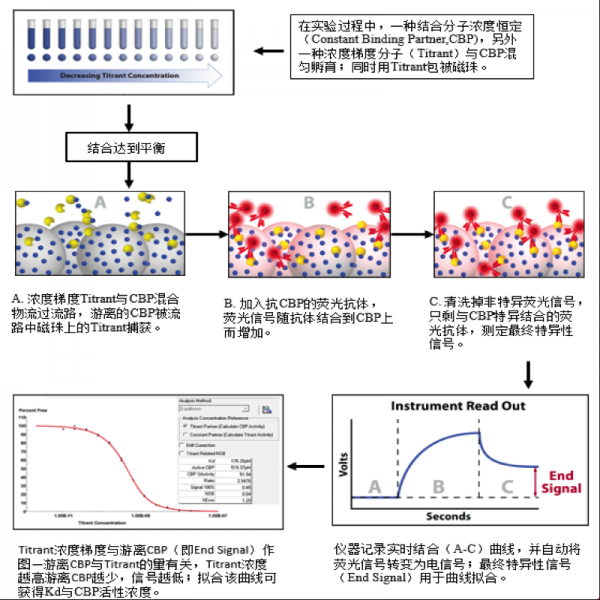 在反应溶液中当受体和配体达到平衡状态时,这时溶液中存在三种物质:受体、配体以及受体-配体复合物。KinExA技术通过包被受体或配体的珠子在短时间内(<0.5s,不影响反应平衡)捕获游离的配体或受体,再通过荧光标记的抗体检测游离的配体或受体的量。检测过程如下: