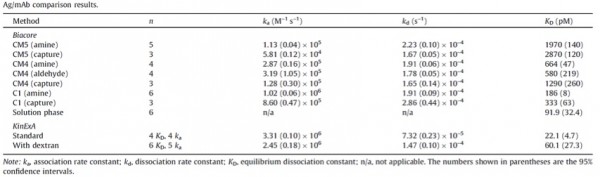 表中的结果说明:对于Biacore技术,不同的固定方式(氨基偶联,捕获)以及不同的芯片,对实验结果均有明显影响。而采用KinExA技术,溶液中加葡聚糖,对结果也无明显影响。