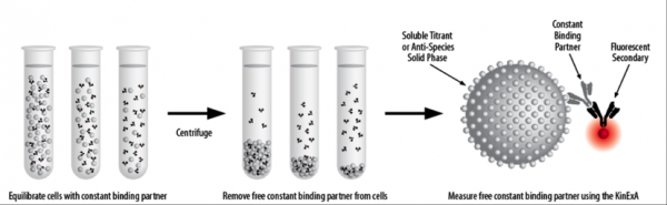 目前市面上除了KinExA技术外,没有其他特别有效的方式检测完整细胞与分子间的亲和力,更无从判断细胞上分子的表达量。KinExA技术可以检测细胞与分子间的亲和力,并且可以计算细胞上分子的表达量。其检测原理如下图,先将梯度稀释的细胞与恒定浓度的分子共同孵育达到平衡,离心之后收集上清液(此时上清液中只存在游离的分子),再通过已提前包被过的珠子捕获游离的分子,用荧光标签的抗体检测游离分子的量,通过检测器检测得到相应的数值后,利用KinExA系统软件进行数据分析。