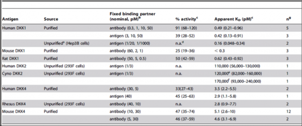下表是Pfizer, Rinat两家公司联合发表的KinExA高亲和力检测范围的文章。