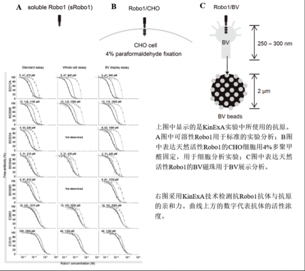 结论:在BV表面展示的肝癌抗原Robo1吸附到磁珠上(BV beads),其KD值(~10pM)与全细胞分析方法一致(R2=0.998),表明基于KinExA技术检测方法提供了针对细胞表面蛋白的单克隆抗体亲和力准确的评估。