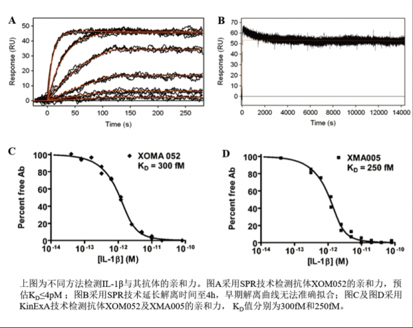 方法:设计抗IL-1β抗体XOM052,SPR检测其与IL-1β的亲和力为≤4pM。另外实验采用Protein A捕获IL-1β抗体,解离10min,发现时间不足以使抗体抗原发生解离,将解离时间延长至4h,解离早期无法准确拟合,推测是由于IL-1β抗体从Protein A上解离对实验造成的影响。为了更的计算亲和力,作者改用KinExA,分析得到其亲和力为300fM。