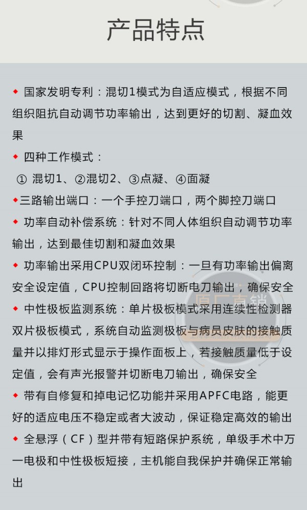 适用于各类中小型手术,低功率下也可用于微创手术(五官,美容整形等手术)