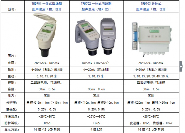 TRD700系列一体式(分体式)超声波液(物)位计是智能型非接触式液(物)位测量仪表。产品具有自动功率调整,增益控制,温度补偿等功能,采用的检测和计算技术,对干扰信号有抑制功能,从而在根本上提高了仪表的测量精度,保证测量结果的真实性。该系列产品可广泛用于各种液体的液位和固体的料位高度测量,也可用于距离的测量。