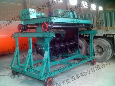 由传动装置、行走装置、翻堆装置、转移车等主要部件组成。电动机直接将动力传给减速器经链轮至翻堆滚筒,滚筒上的搅拌桨叶呈螺旋分布,可将发酵槽内的物料翻转搅拌移动至0.7-1m远的位置,起到翻堆速度快、搅拌均匀的效果,从而达到物料与空气的充分接触,使物料的发酵效果更好。