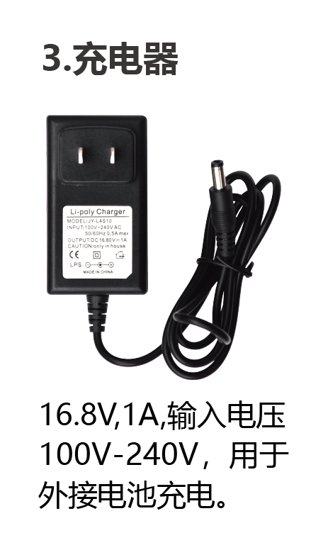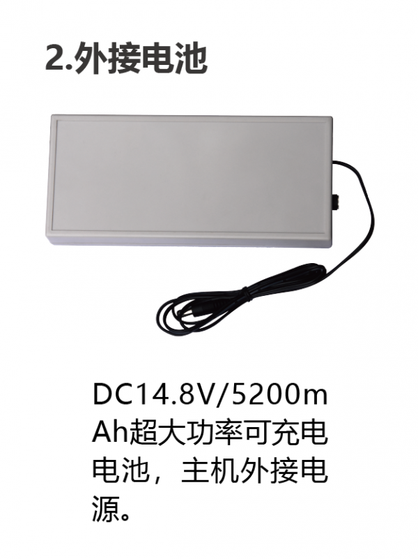 ⑦充电孔:仪器使用DC/14.8V/5300mAh功率可充电电池,该孔为充电器的插入孔,从而为仪器充电。并且充电器在充电时,充电器亮红灯,充满后亮绿灯。