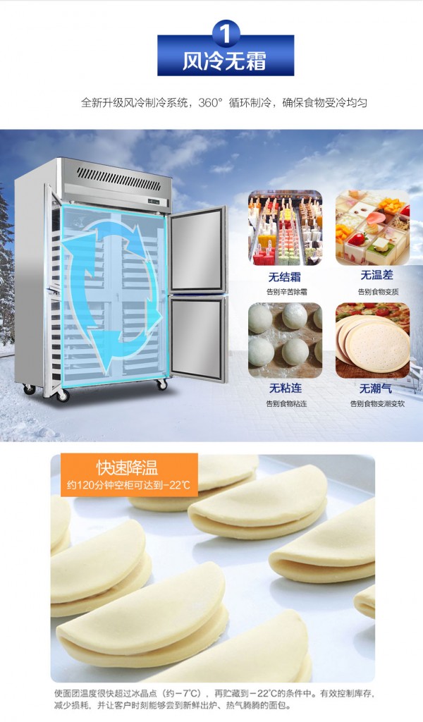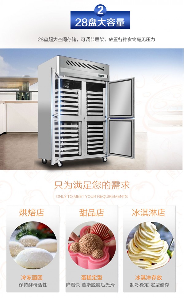 2、采用风冷制冷技术,制冷速度快,温度均匀,可有效速速冻存放各种蛋糕原料及蛋糕胚等。