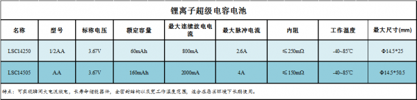 Newcell仪器仪表电源电池超级电容系列有LSC14250 (1/2AA) LSC14505 (AA 5号电池) 等规格型号。