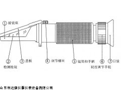1.棱镜座 2.检测棱镜 3.盖板 4.调节螺丝 5.镜筒和手柄 6.视度调节手轮 7.目镜