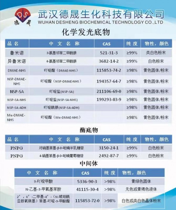 化学发光底物鲁米诺-武汉德晟生化科技有限公司,专业从事采血管添加剂,体外诊断试剂,缓冲剂,发光底物 的研发、生产、销售。在采血管添加剂方面形成了具有知识产权和专业的生产研发能力。为外百余家生产企业提供产品及原料解决方案