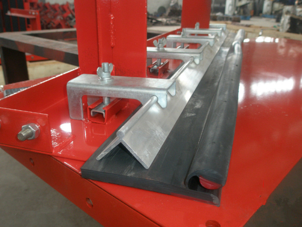 导料槽防溢裙板为双层结构,通过一套快速压紧装置安装在皮带机导料槽的下沿,用于输送带与导料槽之间密封。