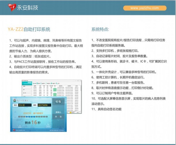 显示胶片和报告数量,并能实时显示正在打印第几张胶片和第几张报告 显示病人姓名和编号 多功能自助报告打印系统胶片数量和正在打印使用语音提示,并有“正在打印,请不要离开”提示 根据医院的需要可以设置胶片和报告单的先后打印顺序 刷卡或扫码后直接打印,不需要任何操作
