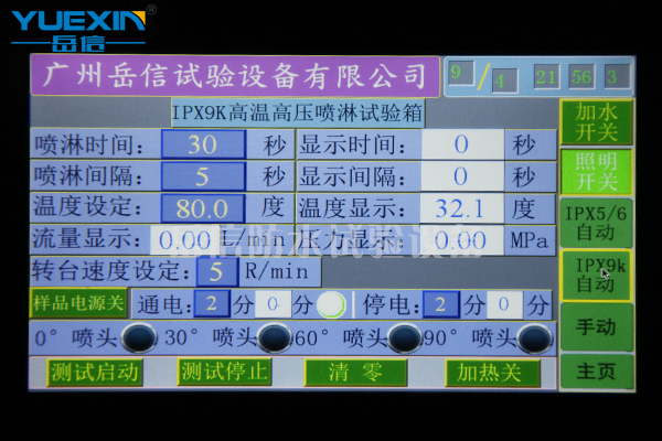 IPX69K高压喷水试验箱-广东工厂销售用于测试产品的IPX5、IPX6、IPX6K、IPX9K防水等级,测试样品包含电子元件、户外灯具、外壳、汽车配件等,采用箱式结构,无场地限制,内箱水循环使用,7寸触摸屏,全新操作系统,更能远程操作,方便快捷。