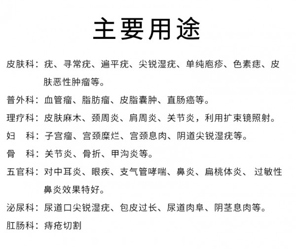 · 皮肤科:疣、寻常疣、遍平疣、尖锐湿疣、单纯庖疹、色素痣、皮肤恶性肿瘤等。
