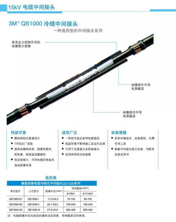3M 冷缩式中间接头采用整体预制式紧凑设计,接头主体由柔软的液体硅橡胶材料制成,在使用中不会因为电缆的弯曲而形成缘死角。材料本身的缘性、耐电痕性、耐高温及耐酸碱性优良, 特殊工艺制造, 具有高弹性,在电缆回路运行中,对电缆本体提供恒定持久的径向压力,与电缆本体同"呼吸",解决交联电缆热胀冷缩过大的难题。3M 冷缩式中间接头采用整体预制式紧凑设计,接头主体由柔软的液体硅橡胶材料制成,在使用中不会因为电缆的弯曲而形成缘死角。材料本身的缘性、耐电痕性、耐高温及耐酸碱性优良, 特殊工艺制造, 具有高弹性,在电缆回路运行中,对电缆本体提供恒定持久的径向压力,与电缆本体同"呼吸",解决交联电缆热胀冷缩过大的难题。
