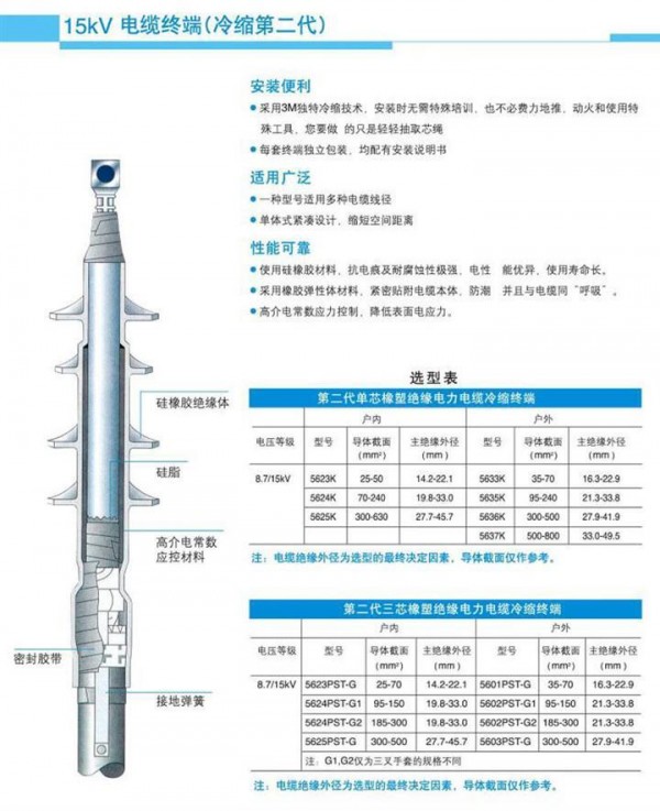 冷缩式单芯橡胶缘电缆终端选型表 电压等级 型号 导体截面 主缘外径 (MM2) (MM) 8.7/15KV 5623K 25-50 14.2-22.1 户内 5624K 70-140 19.8-33.0 户内 5625K 300-630 27.7-45.7 户内 5633K 35-70 16.3-22.9 户外 5635K 95-240 21.3-33.8 户外 5636K 300-500 27.9-41.9 户外
