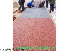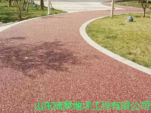 将定量石子,水泥,胶结剂,水投入搅拌后搅拌均匀,由斗车拉送至施工现场,铺装前路基应保持湿润,垫层需要振捣平整,面层需要用水泥抹平机收光抹平,施工完毕后需要用农膜进行覆盖养生,两天后进行洒水养护,养护期间应设隔离带,避免行人通过。养护五到七天,面层干燥后喷涂面层封闭剂。