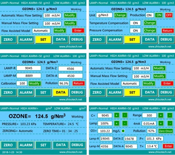 臭氧分析仪带有触摸屏操作界面,实时显示臭氧气体的浓度,带有压力和温度补偿及显示,可设置自动校零时间和手动校零模式。高浓度(g/Nm3)量程带有流量输入功能,可实时显示臭氧发生器的产量。带有两组继电器信号输出,用户可自由选择高报警点和低报警点信号输出连接。核心部件采用紫外长寿命光源系统,采用高透光率石英片,保证零点的稳定性,防止零点漂移影响检测浓度的准确性。根据国外光池技术设计的耐压力,耐冲击的光池结构,校零操作时气体流量、压力、流速保持不变,防止气流冲击对校零产生影响,无需关闭臭氧进气可完成校零操作,保证设备可以每天24小时连续运行。
