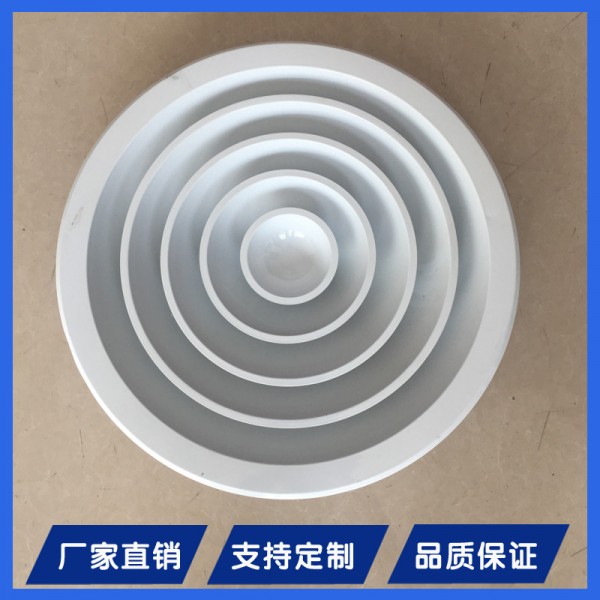铝合金圆形散流器一般用于冷暖送风。通常安装在顶棚上。其吹出气流呈贴附(平送)型,其结构为多层锥面形。由于室内诱导气流大于排风量,因此吹出气流减速较快。