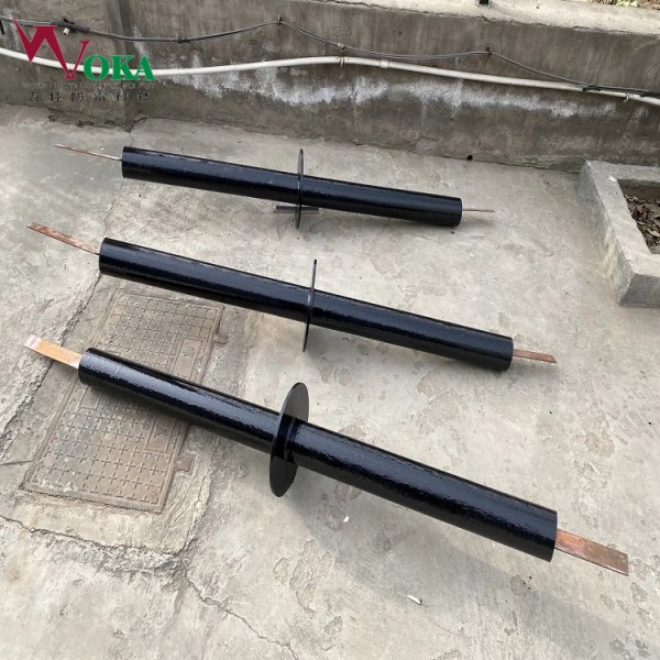 在电气化铁路两侧的管道上,将 4 条管道电缆跨接后,每侧各设置一组固态去耦合器排流系统,该系统由1个改进型固态去耦排流器与接地地组成,邦信固态去耦排流器有分路的两条输出线,一端连接到管道,另一端连接到接地地的汇流电缆上,系统接入后不但有效排出管道上杂散电流还能阻止部分大地中的电流干扰源通过排流系统流入管道。 接地地由1组双锌棒接地极连接组成,各阳极之间导线连接,埋深在冻土层以下,接地极间距为 1.0~1.5米。排流后的管道电压符合相关标准,管道补口采用原材料。
