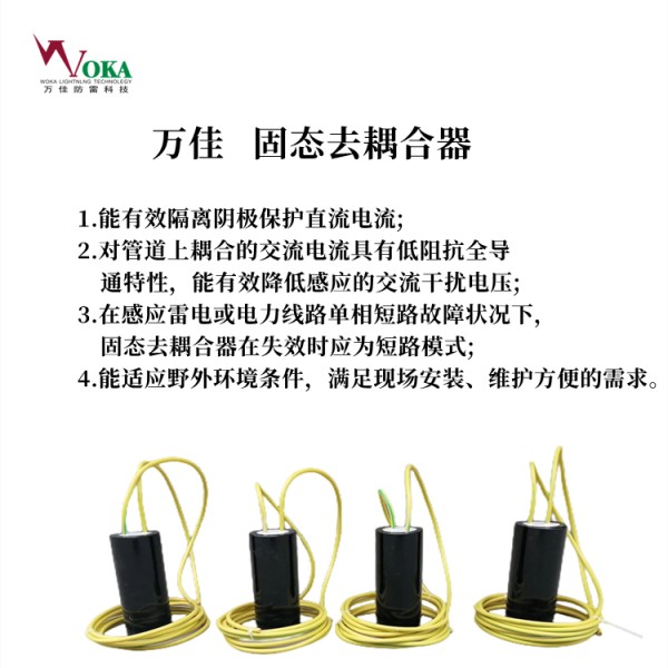 郑州万佳防雷有限公司生产的去耦合器采用先进的固态技术非金属壳体,能安全有效的控制管道上交流杂散电流或雷电流对埋地管道的影响,延长管道的使用寿命。同时,又能防止杂散电流在管道上汇集后对人体的危害以及对通信线路的干扰。 应用范围 管道电位梯度垫(接地垫)的去耦合 对设备进行过交流故障、雷电和开关暂态过程的电压保护(如:绝缘接头、绝缘法兰) 为了安全,用于不同的金属间的去耦合,这些金属在某种情况下会产生交流耦合。 在极保护系统中,电气设备的交流接地和直接隔离 为了减少交流感应电压的场所