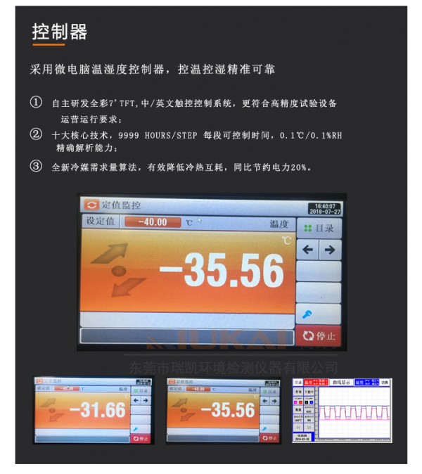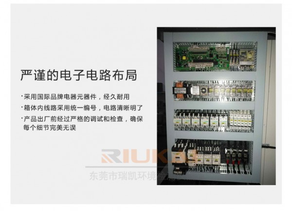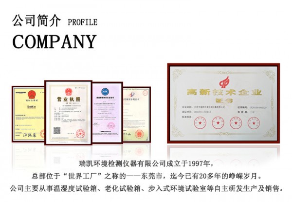东莞市瑞凯环境检测仪器有限公司(简称:RIUKAI/瑞凯仪器),成立于1997年,是一家主要制造模拟环境可靠性试验仪器、汽车整车与零部件可靠性试验设备的大型企业,如:恒温恒湿试验箱、高低温试验箱、步入式环境试验室、冷热冲击试验箱、高压加速老化试验箱、温湿度振动综合试验箱等百余品种试验设备,在北京、江苏昆山、湖南长沙、陕西西安等地成立了销售网点(办事处)。